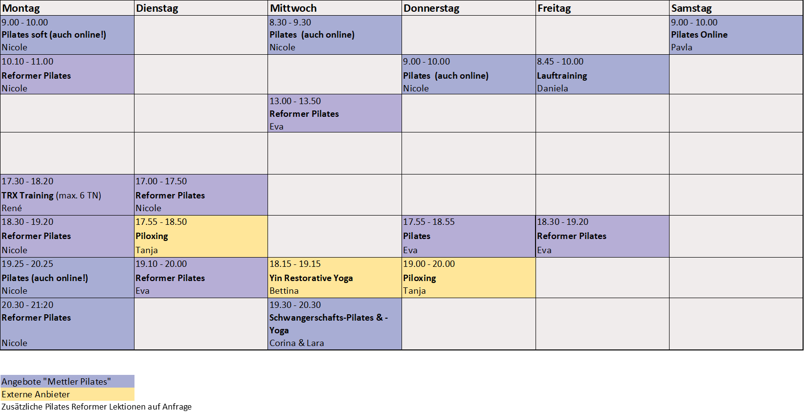 Folgende Kurse werden auch im Pilatesstudio "Mettler Pilates" eingenständig angeboten: